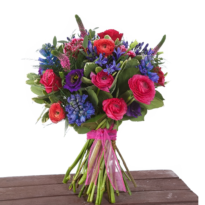 Contrasting deep pinks and blue flowers combine to make a beautiful bouquet of flowers wrapped in a pink ribbon for your mother.