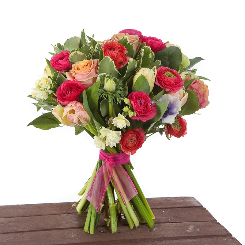 A stunning bouquet of red pinks and whites wrapped in a beautiful pink ribbon for your mother on mother's day