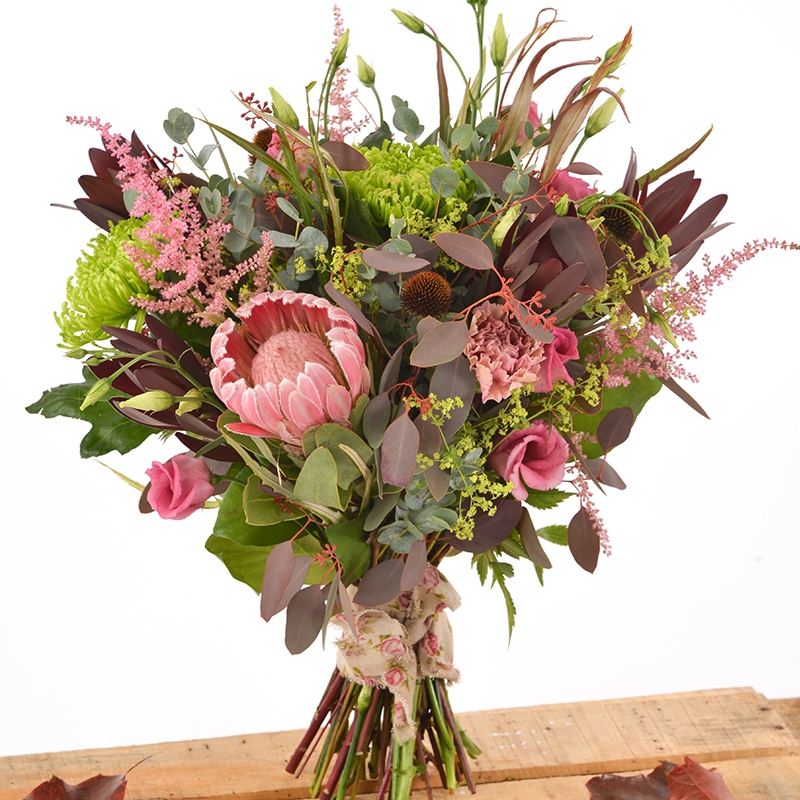 Stunning late summer hues toned with rustic browns and reds in this natural handtied bouquet.