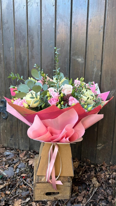 A beautiful selection of soft pink and crisp white flowers. Hand picked and beautifully arranged by Tasha or Ella.
