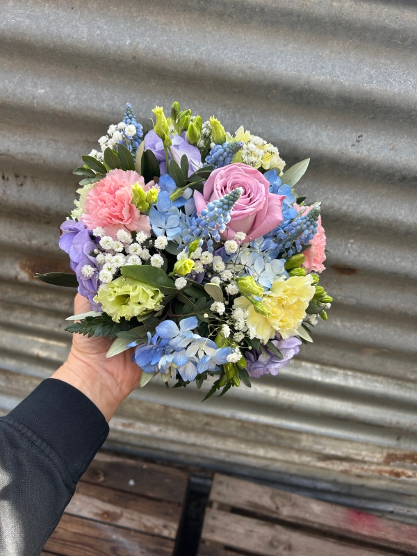 A beautiful posy in a selection of gentle pale colours, created in honour and to remember a loved one. Perfect for placing at a graveside or kept close in quiet remembrance.