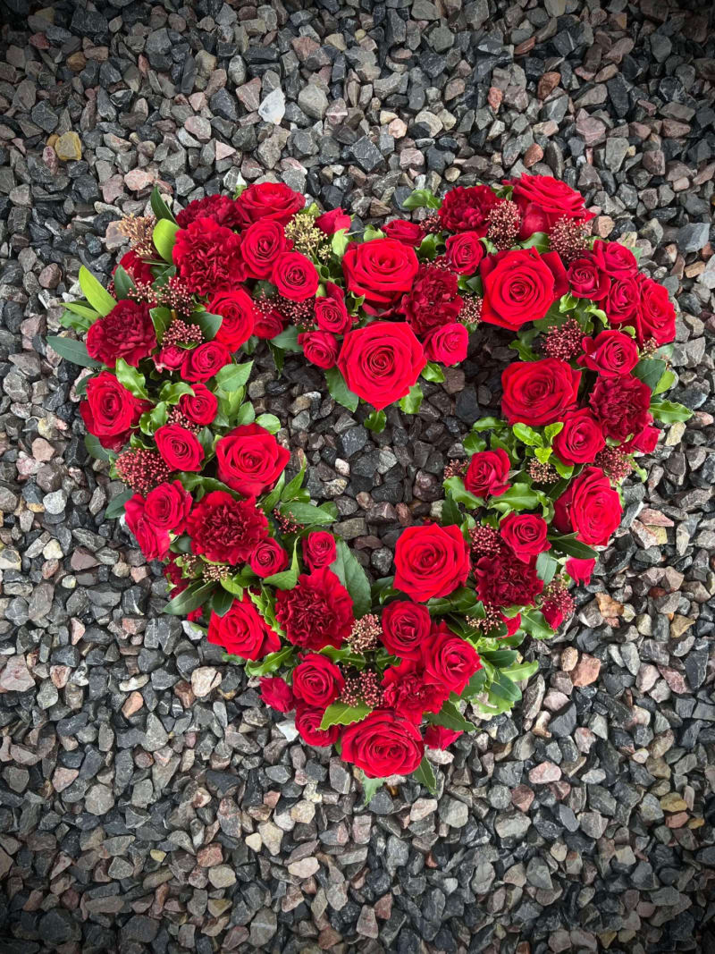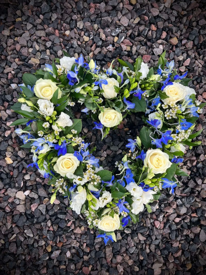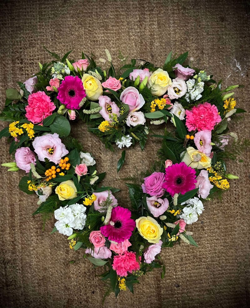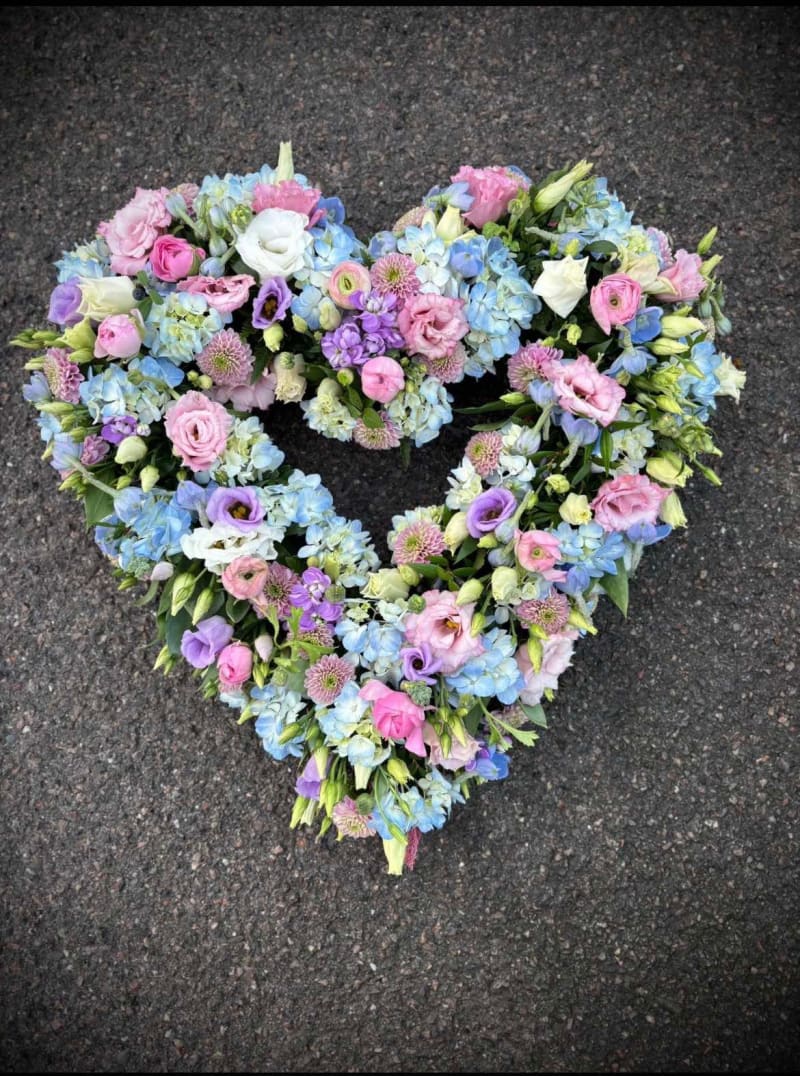 Open Heart tribute made with a selection of seasonal flowers, can be made in a colour selection of your choice, a ribbon edge can be added and a ribbon sash with lettering on request can give it a personal touch.